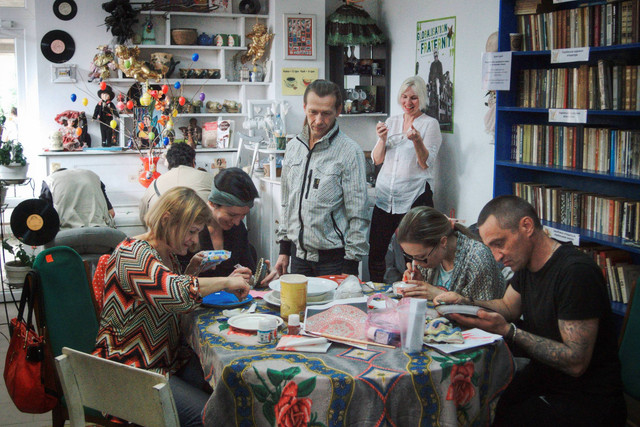 Для клієнтів благодійної крамниці ми періодично організовуємо різні майстер-класи, літературні вечори та інші заходи. Цього року провели кілька майстер-класів з розпису тарілок за участі колишнього мешканця спільноти Геннадія Богуша. Традиційно перед Великоднем ми вчили дорослих та дітей малювати писанки.